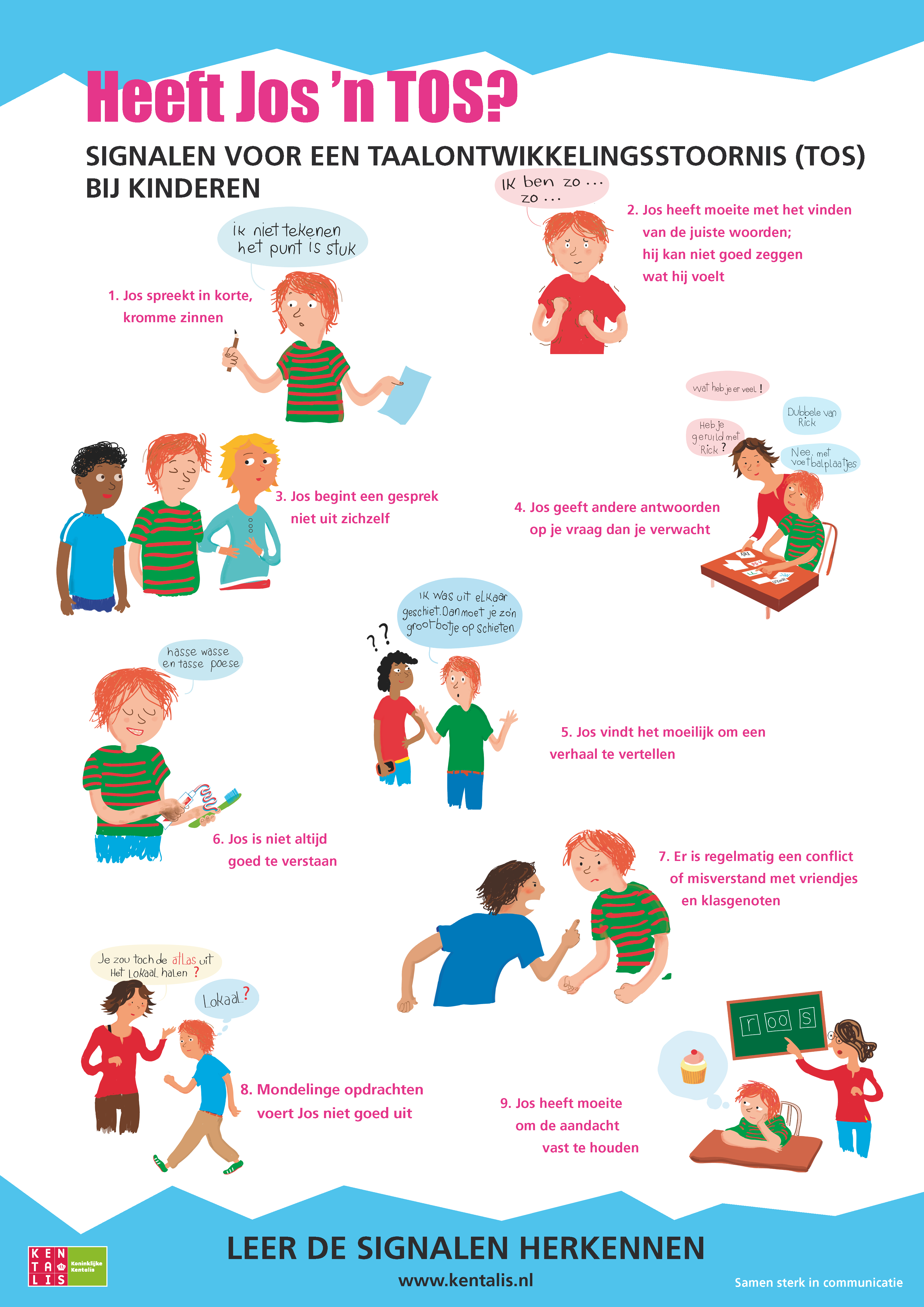 Praat je peuter nog niet of heel weinig? Is je kind stil in de klas, spreekt hij onduidelijk of struikelt hij vaak over zijn woorden? Begrijpt je kind soms niet wat je zegt? Herken je jouw kind in deze poster? Dan kan het zijn dat je kind een taalontwikkelingsstoornis (TOS) heeft. Bij heel jonge kinderen kan het soms nog lastig zijn om te bepalen of er een TOS is en wordt er gesproken over een vermoeden van TOS.